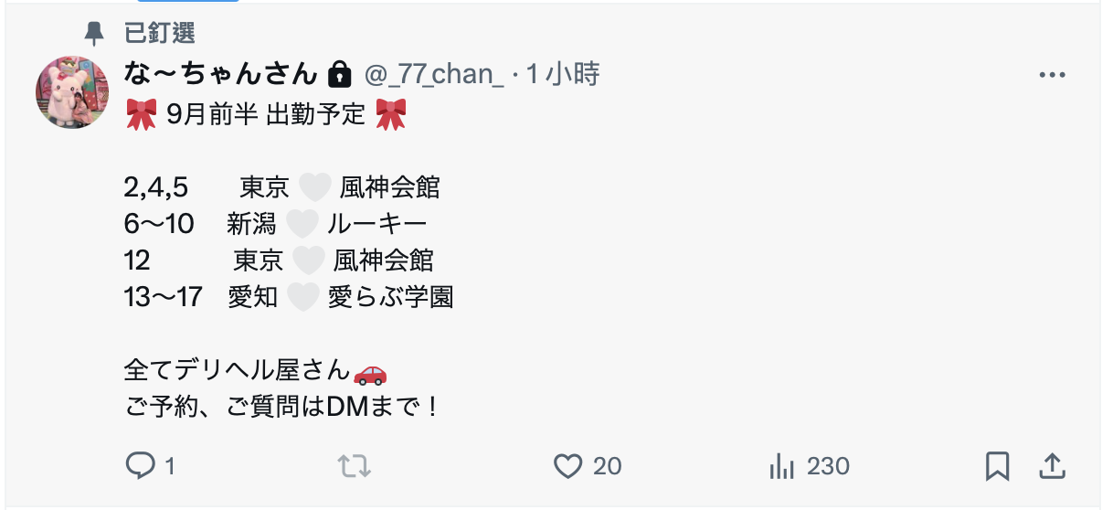 小号置顶文就告诉大家9月可以到哪里找她,所以什么拍过写真当过偶像还参加过户外活动都已经是过去,现在她就是个不做AV女优专心做风俗的外送茶了⋯