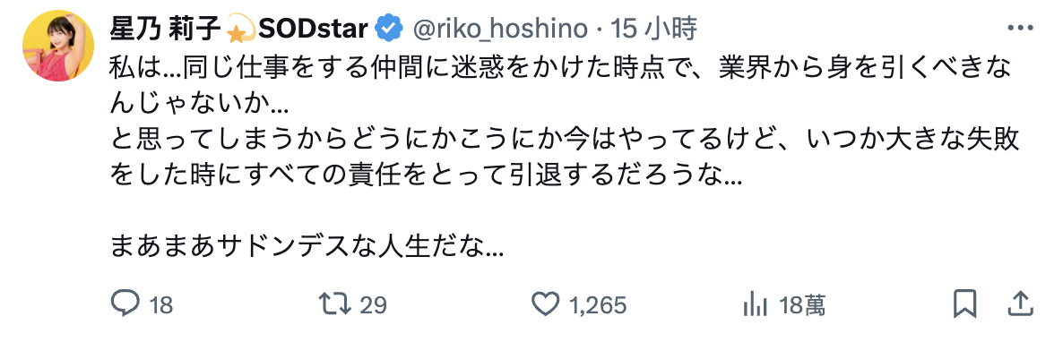昨天,她在X(https://x.com/riko_hoshino)的两段发言让人非常担心,我们先来看「结果」: