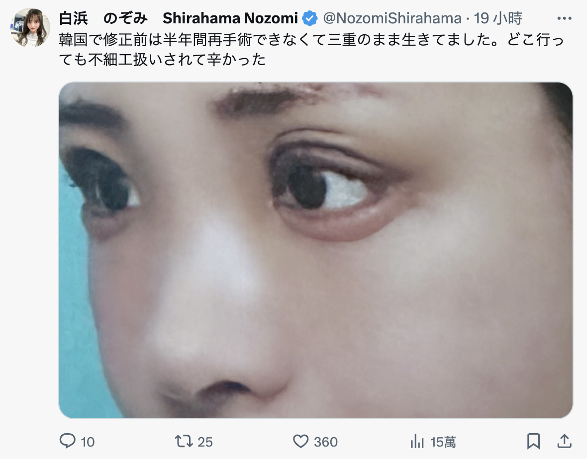 就是「整形失败」,今年她之前在银座超有名的整容医院进行手术,由于是指名浦动刀还要加付25%的费用,结果手术失败了——虽然后来费了还退,但手术她就堕了手术然后重新失败的畸形循环,眼睛的部分最惨,五次手术通通失败,让她没能继续工作,粗估损失在1000万日币……