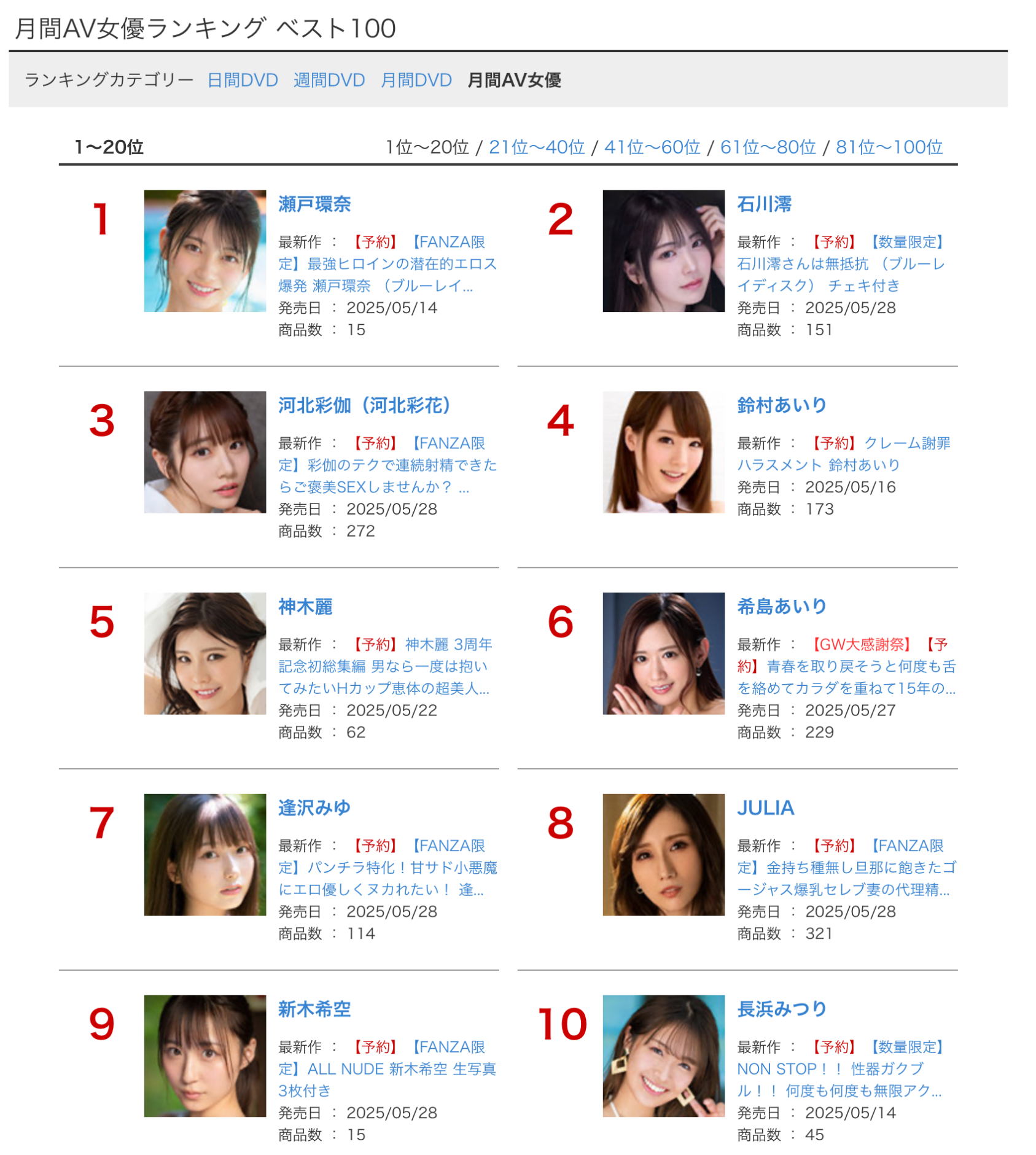 最后看累计销量排名的月间AV女优排行榜,音乐家是前10名只有一位策划女优进榜,那就是「逢沢みゆ(逢泽美优)」,其实她确实做了正确的选择,然后继续当专属女优销售不振,不如成为企划女优疯狂发片乱棒打死老和尚,她完全没有适应期,不只是在FANZA这个平台销售强滚,作品在各个卖实体片的店铺也都卖得吓哭:
