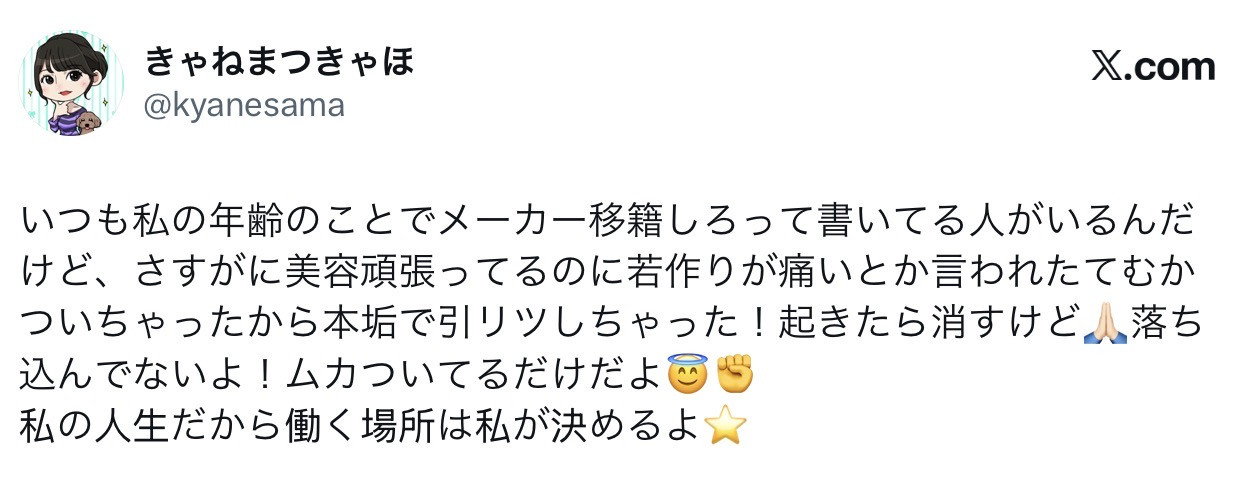 一直有人说我年纪大,叫我换片商,明明我那么努力保养,却被说是「装年轻不太好」,真的让人很火大,等等起床后我就把转推的文删掉,我并没有难过,就是不爽!