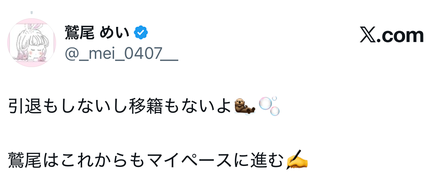鹫尾是这么说的:「这次很多事情没办法和大家说明,可以会让大家感到不安,但我一样会专注于自己的工作,只想守住对自己重要的东西⋯」