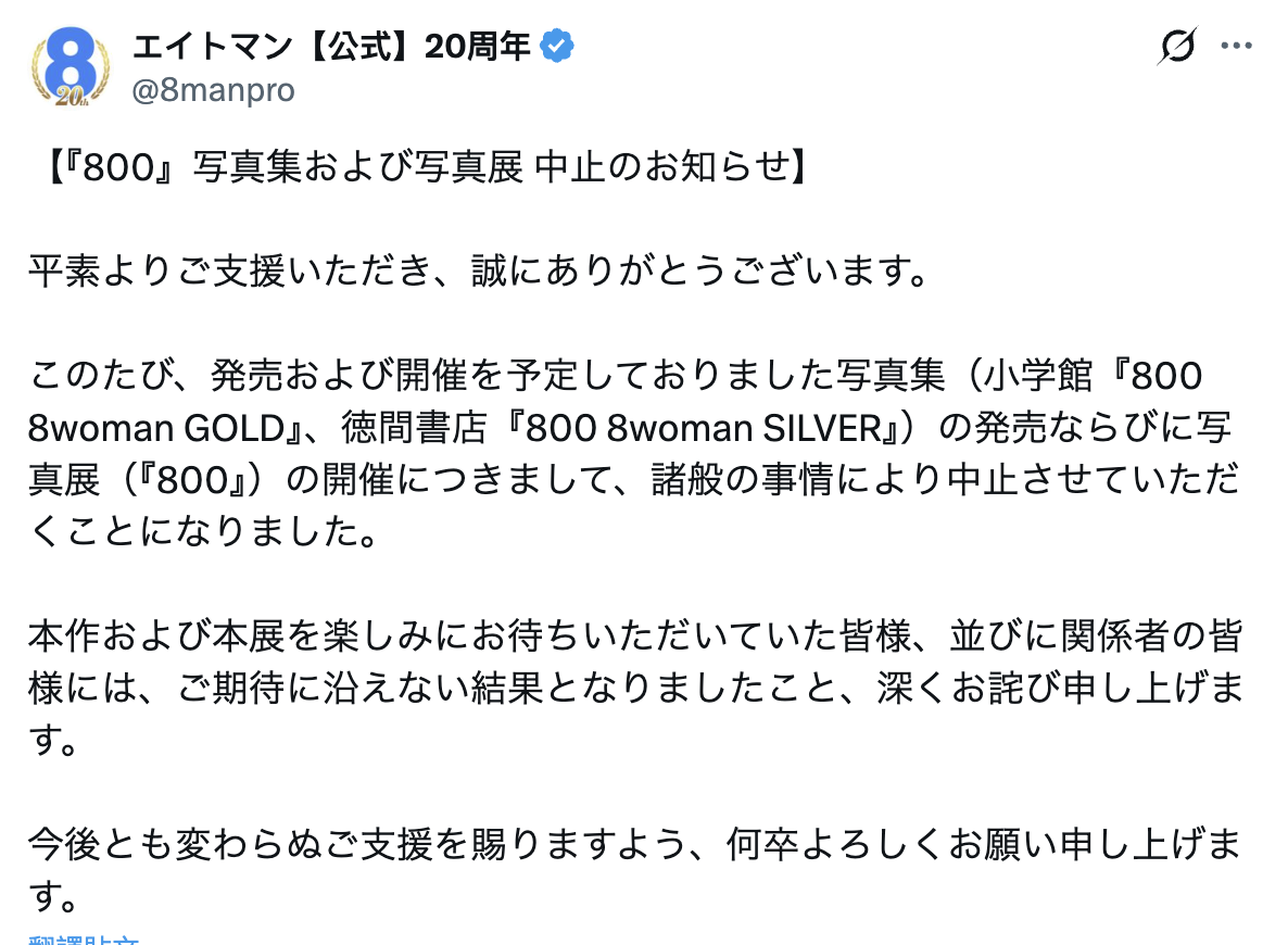 莫名其妙冒出这么一篇真的有点奇怪,但鹫尾所属的经纪公司エイトマン(8MAN)有更奇怪的事:他们在官方X(https://x.com/8manpro)宣布,不只原定预定举办的写真展没了,就连和两家出版社谈好的写真集连动计画也取消,虽然没有说明原因,但已经让人闻到不对劲的味道惹~